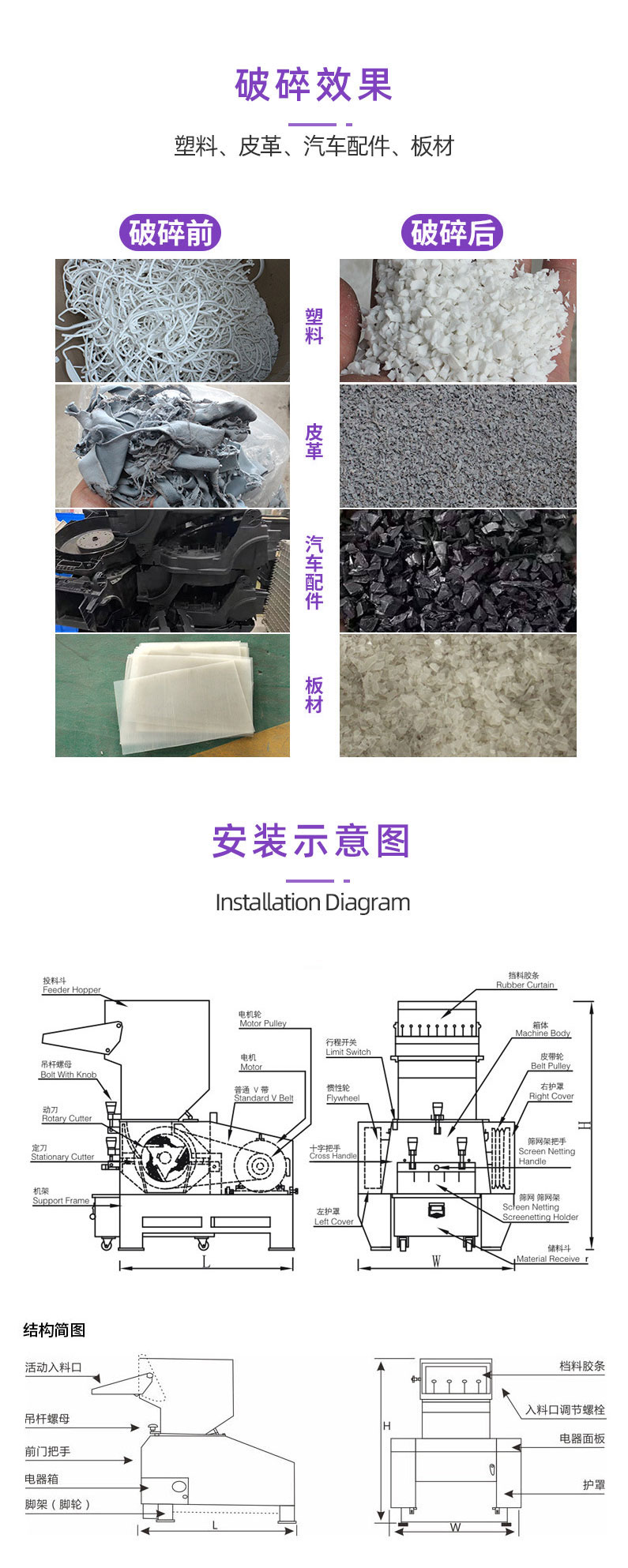 塑料破碎機(jī),大型塑料破碎機(jī)的特點(diǎn)強(qiáng)力破碎機(jī)刀具采用名廠優(yōu)質(zhì)精鋼精工而制,特別堅(jiān)固耐用,粉碎各類(lèi)軟、硬塑膠,輕松容易。前后隔音防音設(shè)計(jì),噪音極小。設(shè)計(jì)精簡(jiǎn),占地特少,維護(hù)容易。門(mén)較式分離設(shè)計(jì),清掃換網(wǎng)特別容易。馬達(dá)裝有過(guò)荷保護(hù)與電源連鎖保護(hù),保護(hù)馬達(dá)、刀具、工作人員。制造工藝成熟、機(jī)體、刀架等主要部件采用整體加工,確保配合精度。粉碎膠頭、薄膜,有特別粉碎機(jī)供選擇,以更好的適應(yīng)。